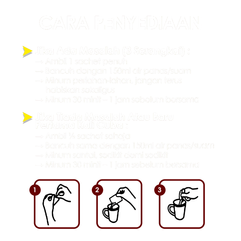 Hanya 1 sachet 30 minit sebelum bersama, bermula bantu Zakar lebih tegang dan tahan lama ( kekal tegang ) selama anda masih mendayung.